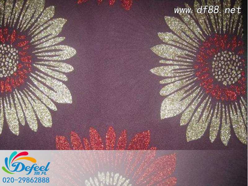 在用金银粉进行印花时,我们通常使用环保型金葱粉水性胶水,这种胶水牢度好,不易脱落,光泽好,透明度高,不影响金银粉光泽,耐水洗,不粘手,抗氧化性能好,不易变色,不塞网,易操作。适应范围适用于棉纺,棉纺纺织物的金银粉,金银片、五彩粉、闪光粉、闪光片、聚晶粉、银光粉、金葱亮片、银葱亮片、金葱长条、高温镭射片、珍珠粉、七彩片的印花。