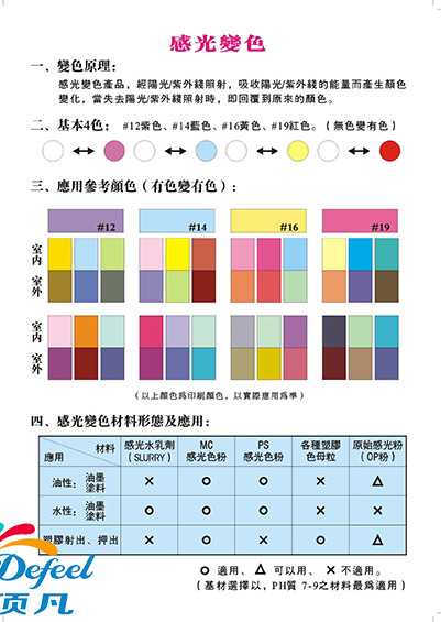 二. 光变色原理:顶凡光变粉利用UVA的能量将感光分子键打开,使它从低能阶跳到高能阶。即从不可见光跳到可见光,从而产生颜色的变化。当失去紫外线照射或温度升高超过45ºC时,感光分子键关闭,即回复到原来的颜色。